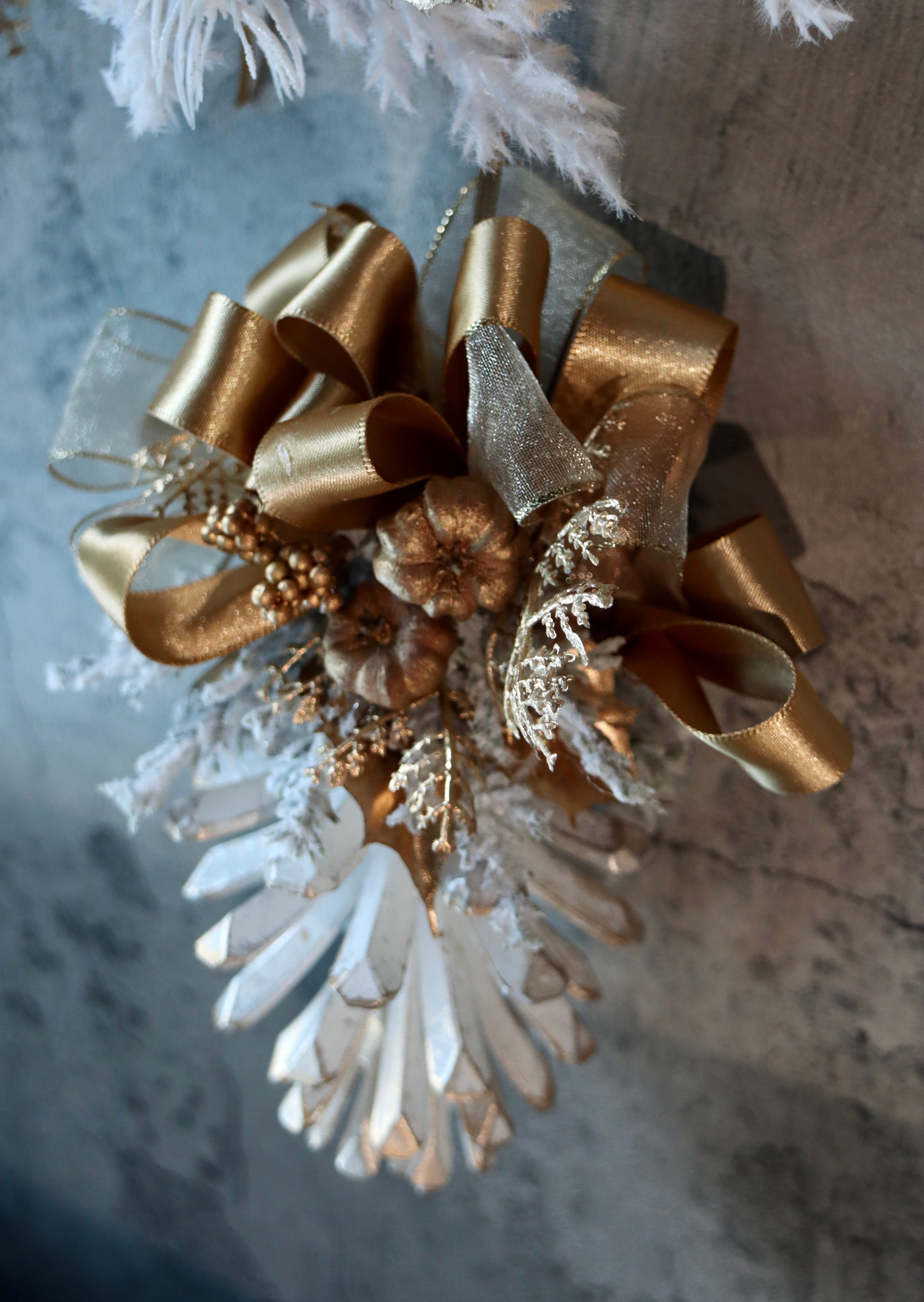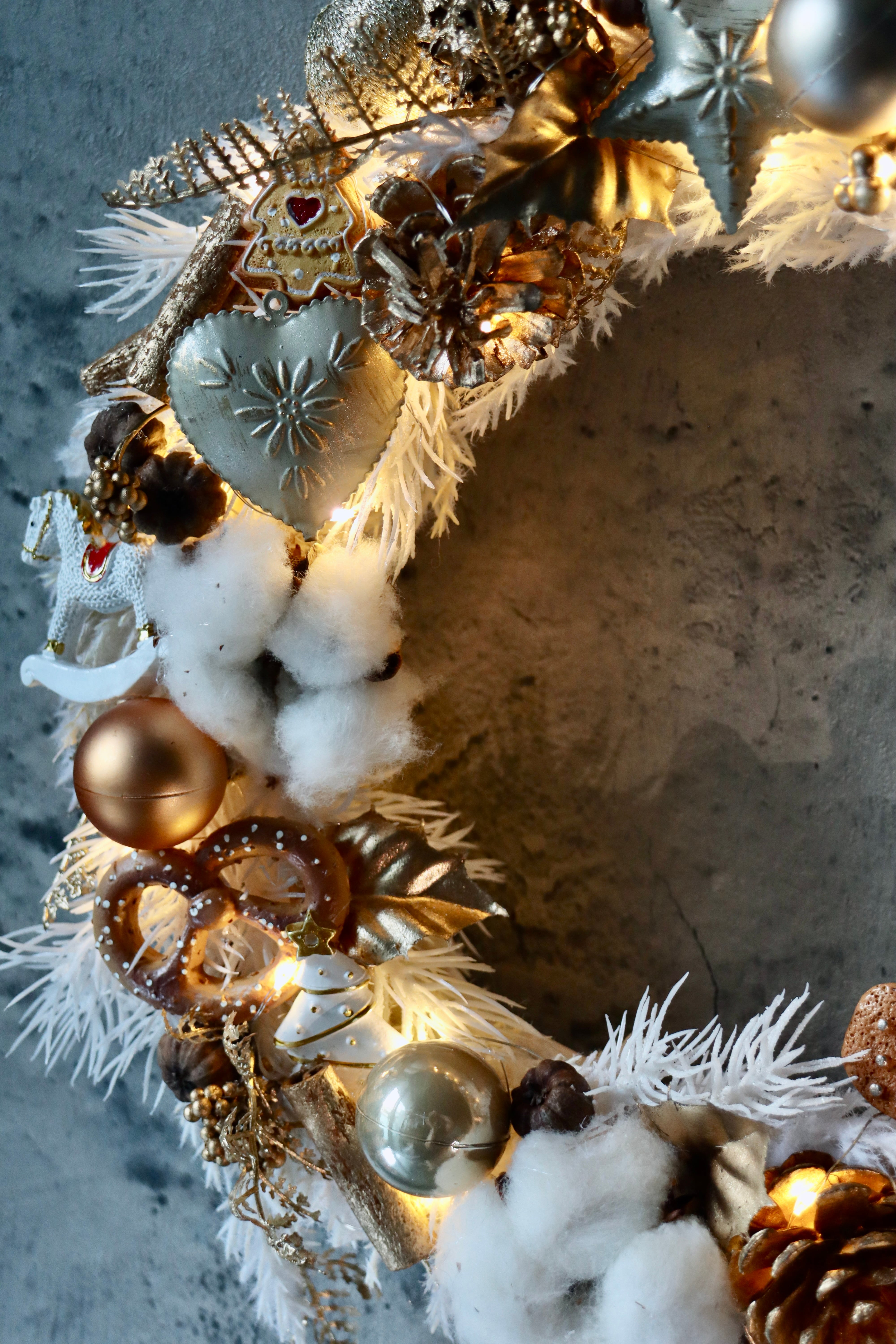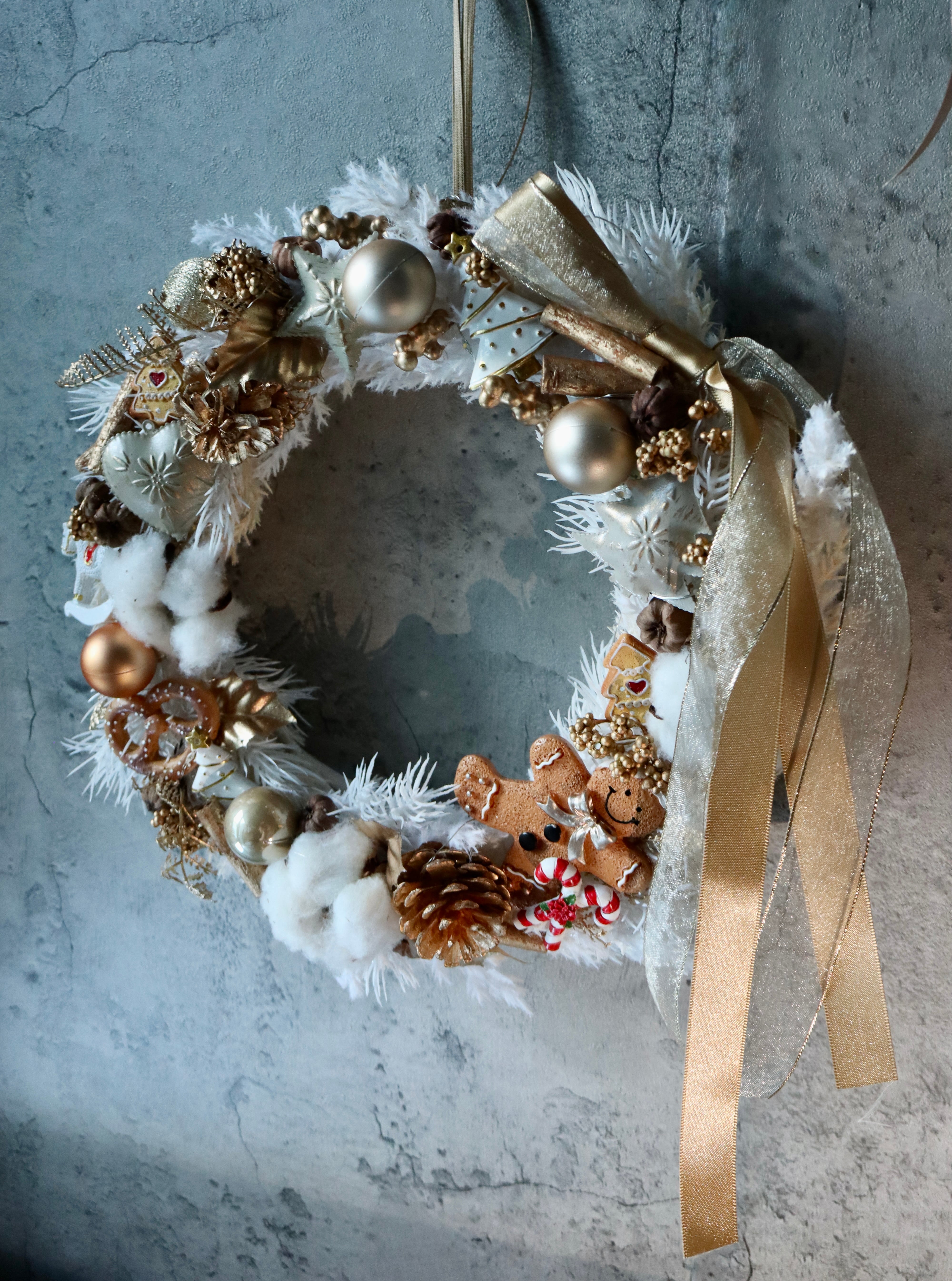 造花のホワイトリースにゴールドのオーナメントなどを付けた
